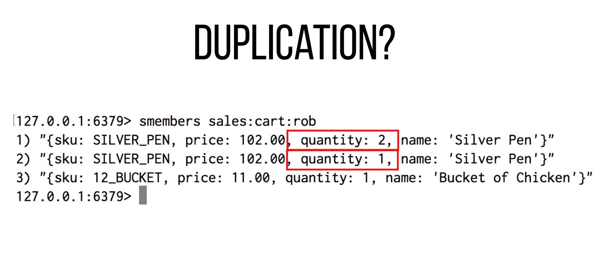 By changing the quantity in our CartItem we have made our JSON string unique, causing duplication. We need to remove these duplications now, otherwise our customers wonât be happy.