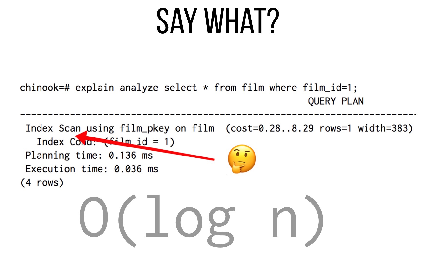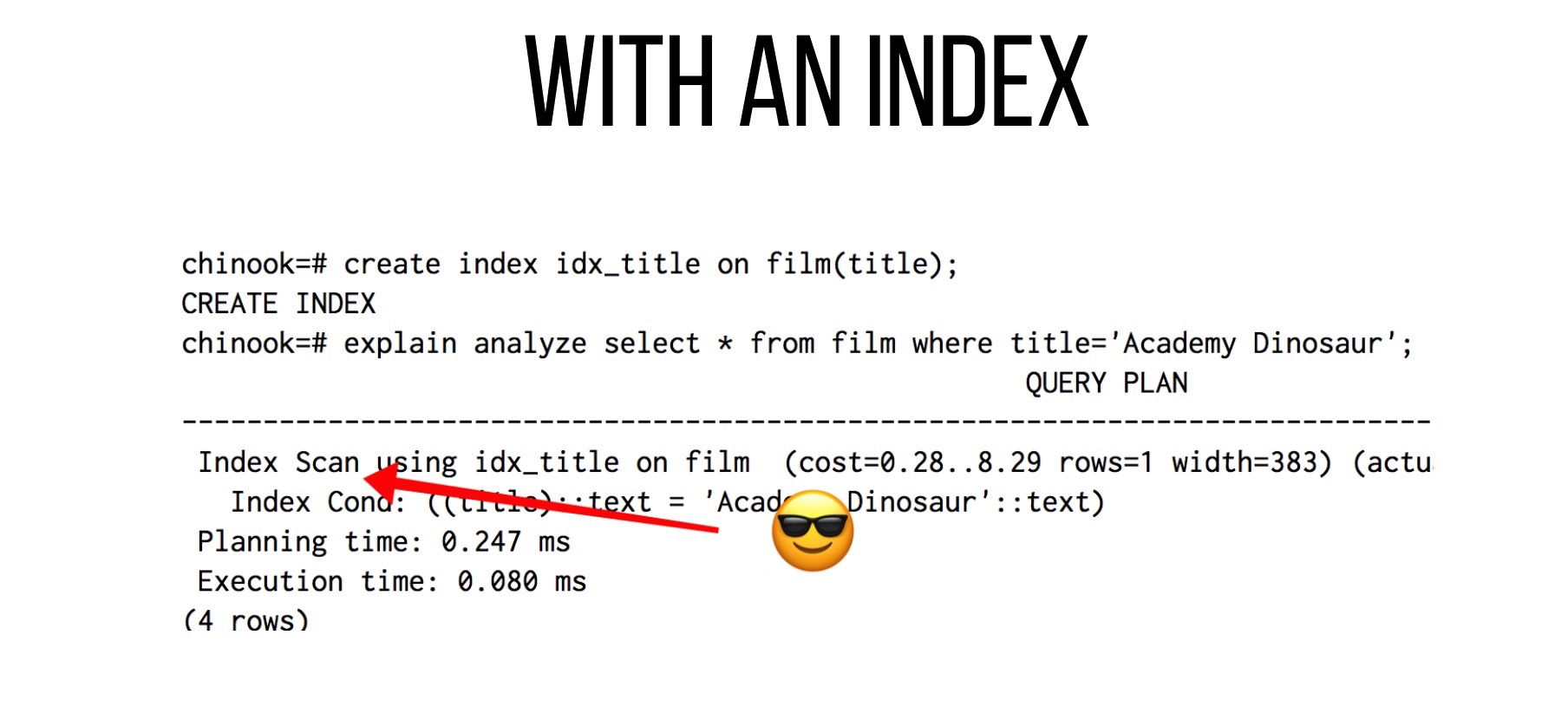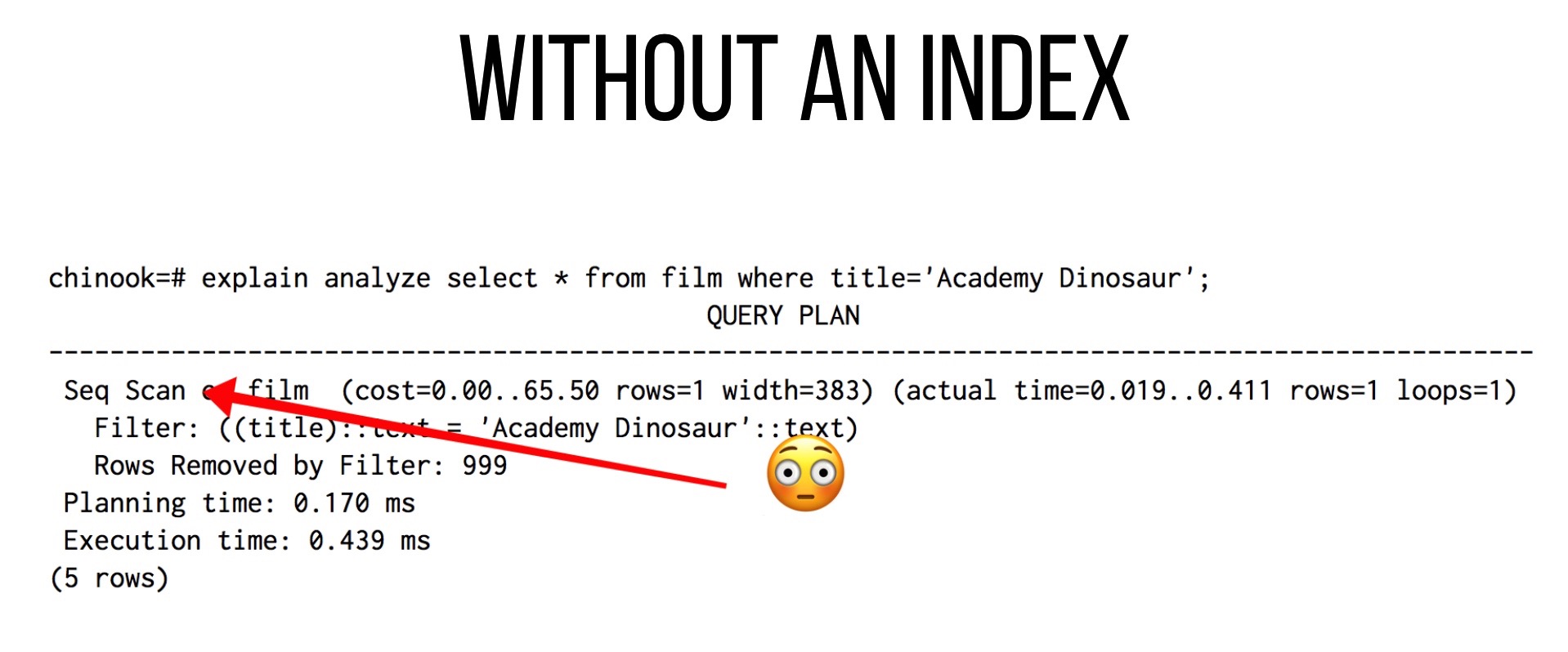 Hereâs the thing: tables tend to grow over time. Letâs say that our commerce site is selling independent digital films and our catalog is constantly growing. We might have a table called film filled with ridiculous test data that we want to query based on title. Unfortunately, we donât have an index just yet and our query is beginning to slow down. We decide to ask PostgreSQL whatâs going on using EXPLAIN and ANALYZE: