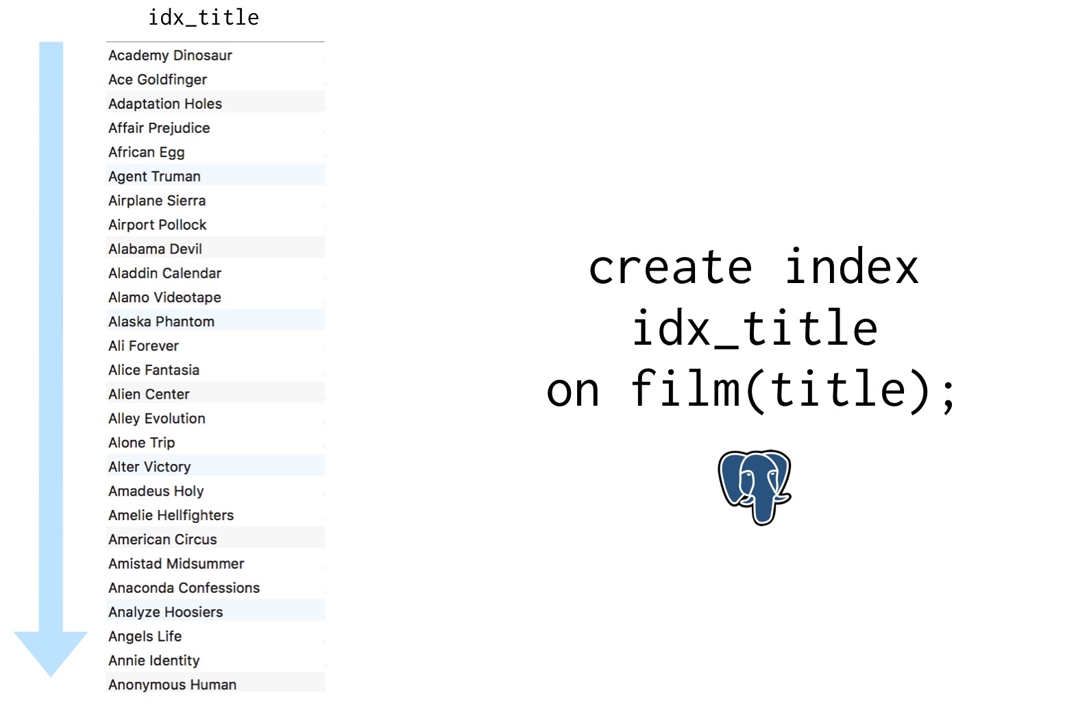 Now that the index is sorted, Postgres can find the title weâre looking for by systematically splitting this list in half until thereâs only one row left, which will be the one we want.
