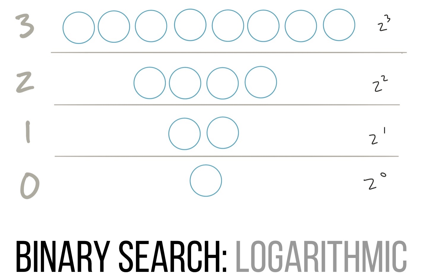 This is an inverse squaring operation as weâre going from 2^3 (8) down to 2^2 (4) down to 2^1 (2) and finally 2^0 (1). Inverse squaring operations are called logarithms. That means that we can now describe the operations of our database index as âbeing logarithmicâ. We should also specify âlogarithmic of whatâ to which we can answer âwe donât know, so weâll say itâs nâ, also known as O(log n).